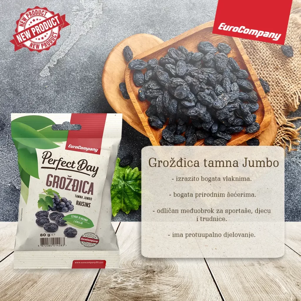 GROŽĐICA TAMNA JUMBO će zasigurno zadovoljiti vašu želju za zdravim i ukusnim snackom. Jedinstvena, velika i sočna grožđica, koja će vašem tijelu pružiti esencijalne hranjive tvari i eksploziju okusa. Savršena